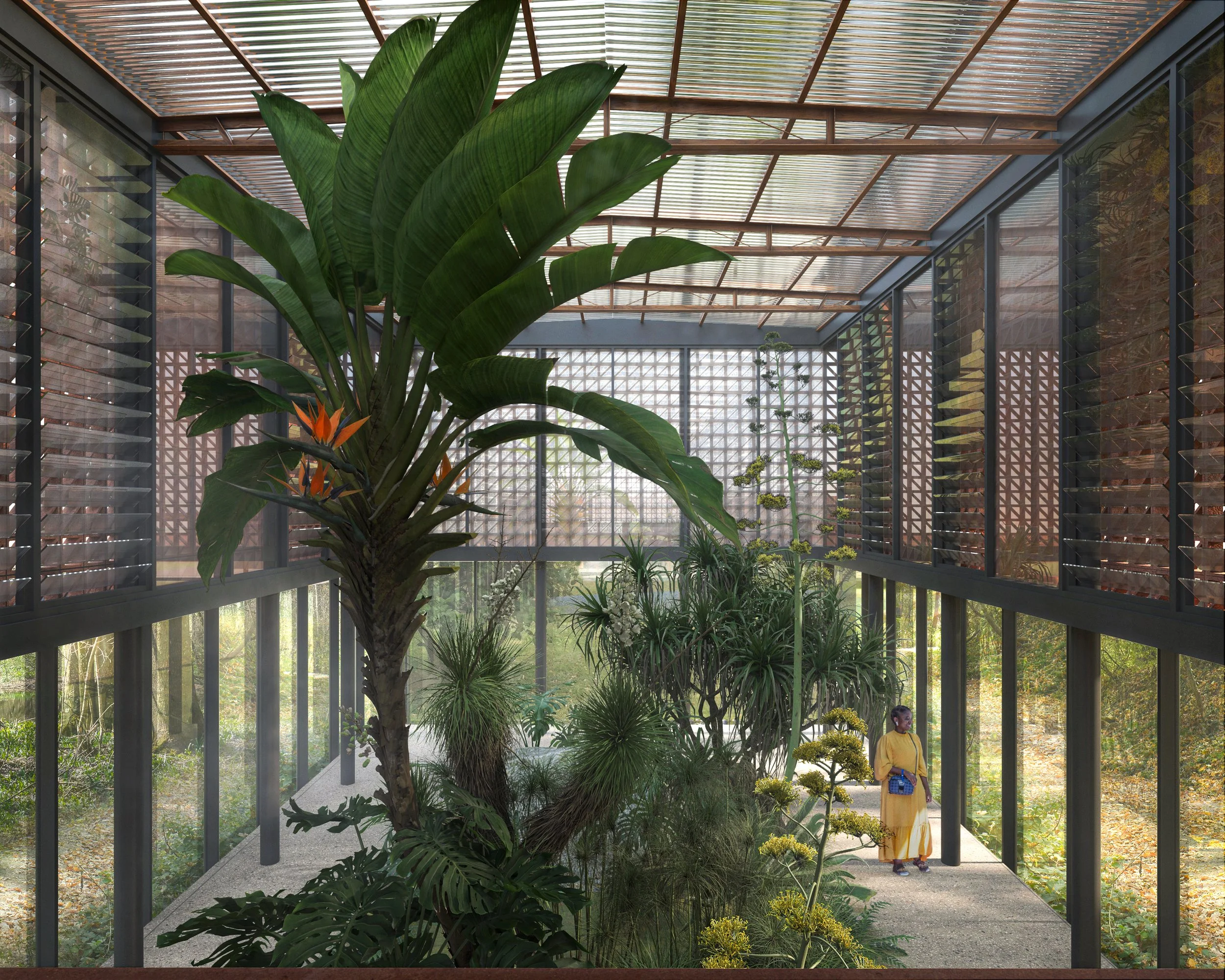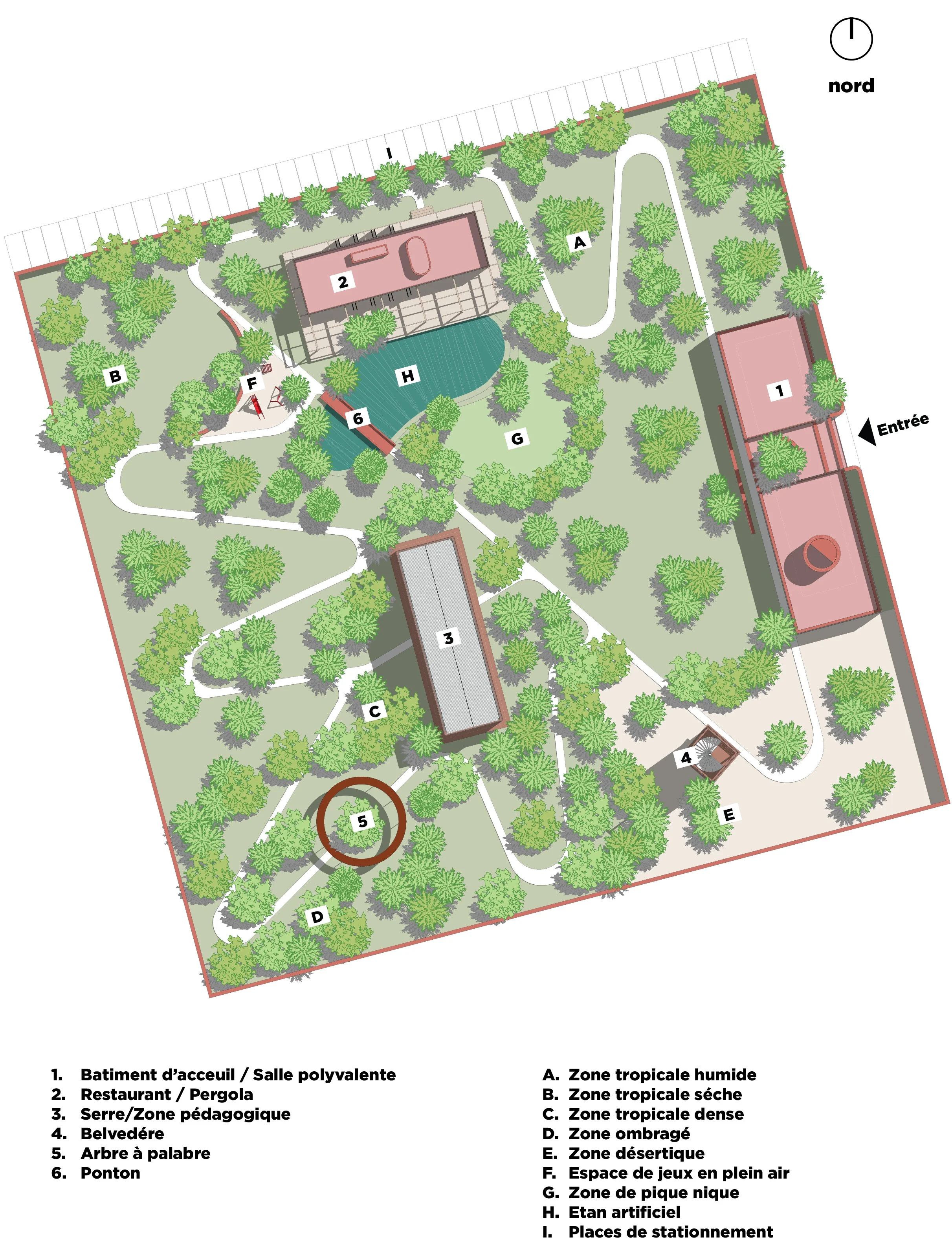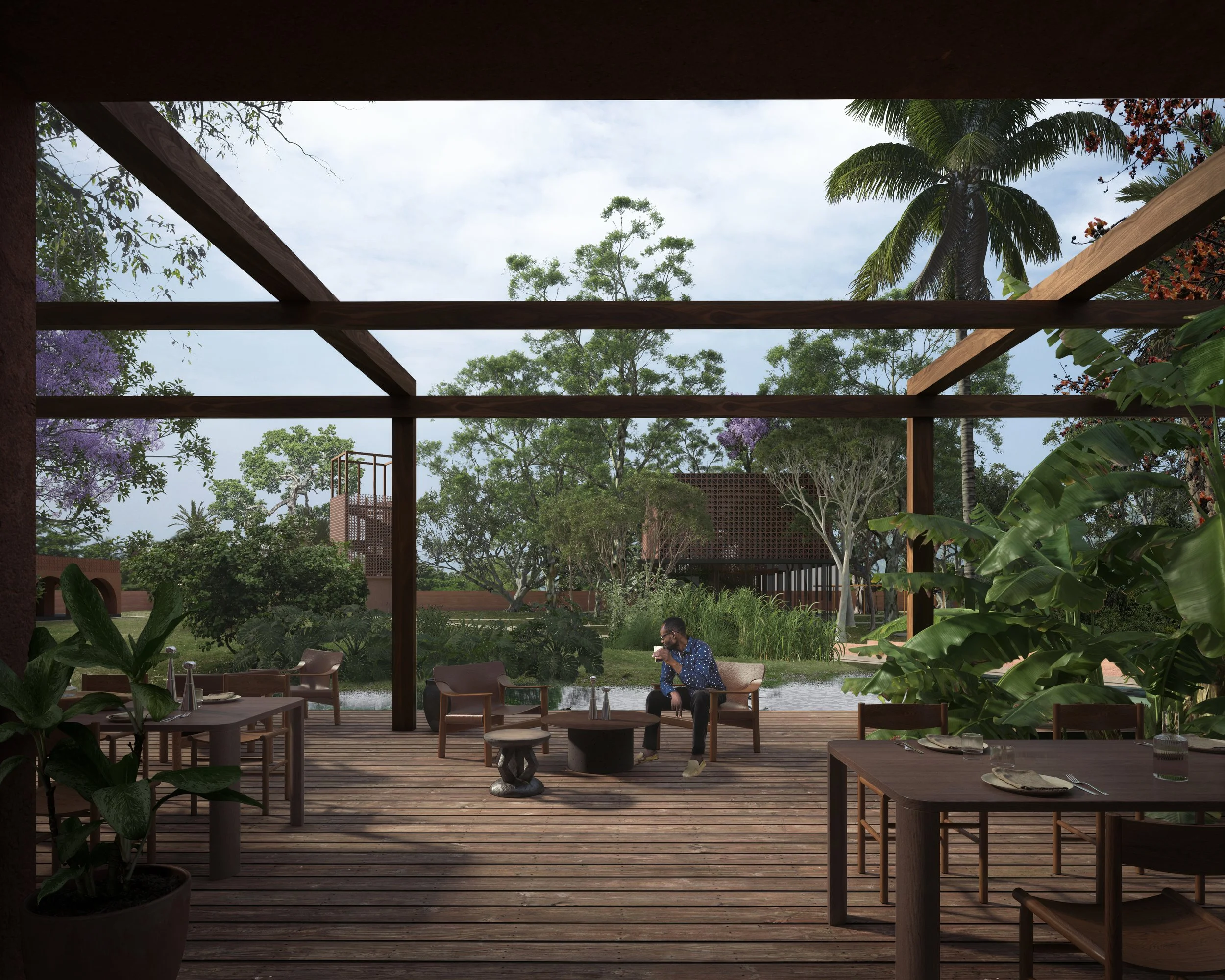 Le projet du Jardin Botanique d’Aného repose sur une intégration étroite entre architecture et paysage, afin de créer un site où nature et structures bâties dialoguent en harmonie. Du bâtiment d’accueil immersif au restaurant ouvert sur les zones tropicales, en passant par une serre transparente pensée comme un prolongement des écosystèmes environnants, chaque intervention renforce l’expérience sensorielle et pédagogique du lieu. Le parcours est enrichi par des espaces emblématiques tels qu’une aire de jeux éducative, un « arbre à palabres » célébrant l’héritage culturel, et un belvédère panoramique reliant le jardin à la ville. L’ensemble compose un projet à la fois écologique, culturel et touristique, dédié à la préservation, à la transmission et à la découverte.