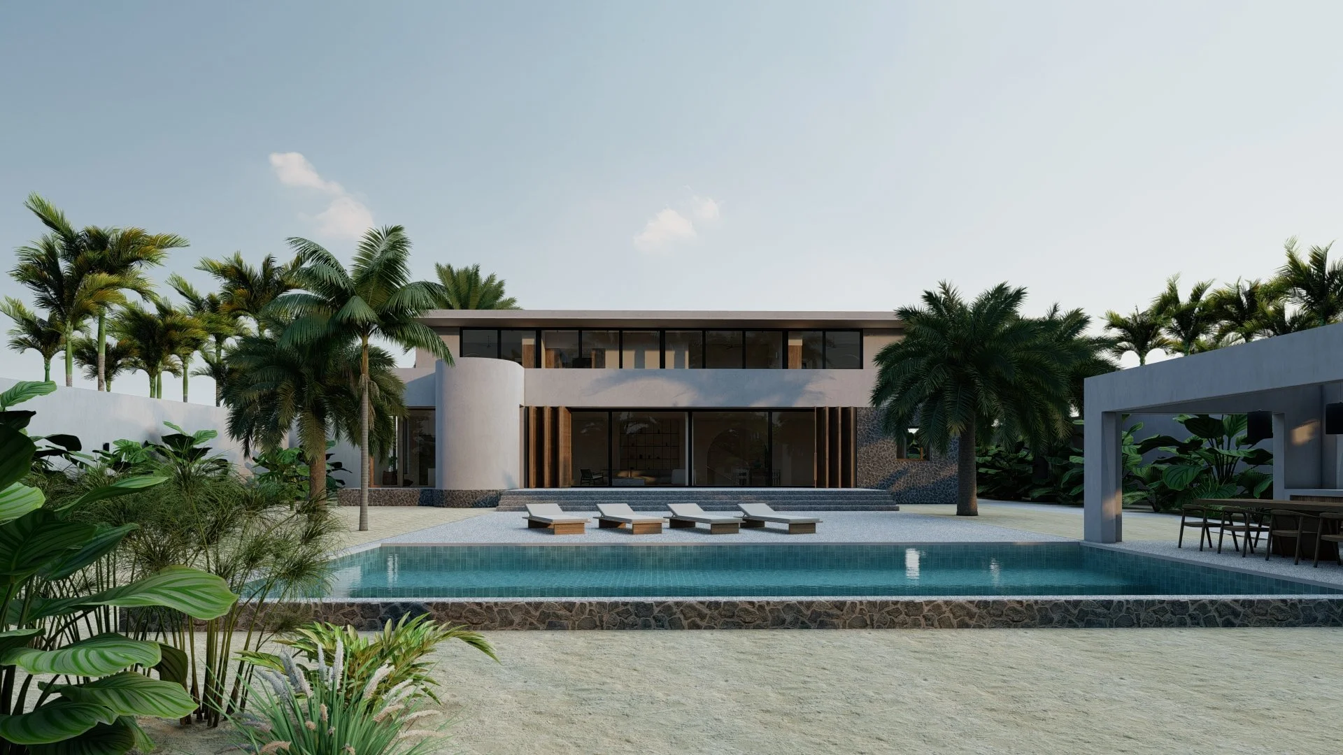 Ce projet s’organise autour d’un bâtiment principal et d’une dépendance, articulés autour d’une cour intérieure végétalisée qui structure les circulations et favorise lumière et ventilation naturelles. Le bâtiment principal accueille une suite parentale indépendante au rez-de-chaussée, un vaste séjour traversant ouvert sur la lagune et prolongé par une terrasse et une piscine, ainsi que trois suites à l’étage accessibles de façon autonome, deux bureaux et des espaces de service regroupés. La dépendance comprend une chambre indépendante, un garage à jetski et un abri pour cinq véhicules. Conçu selon une approche bioclimatique, le projet exploite l’orientation nord-sud, les vents dominants et de larges baies vitrées protégées par des débords, garantissant confort et sobriété énergétique. La pierre, matériau principal, renforce l’identité minérale et la durabilité de l’ensemble, tandis qu’une cabane en bord de lagune, dédiée aux massages, incarne l’esprit de calme et de reconnexion à la nature.