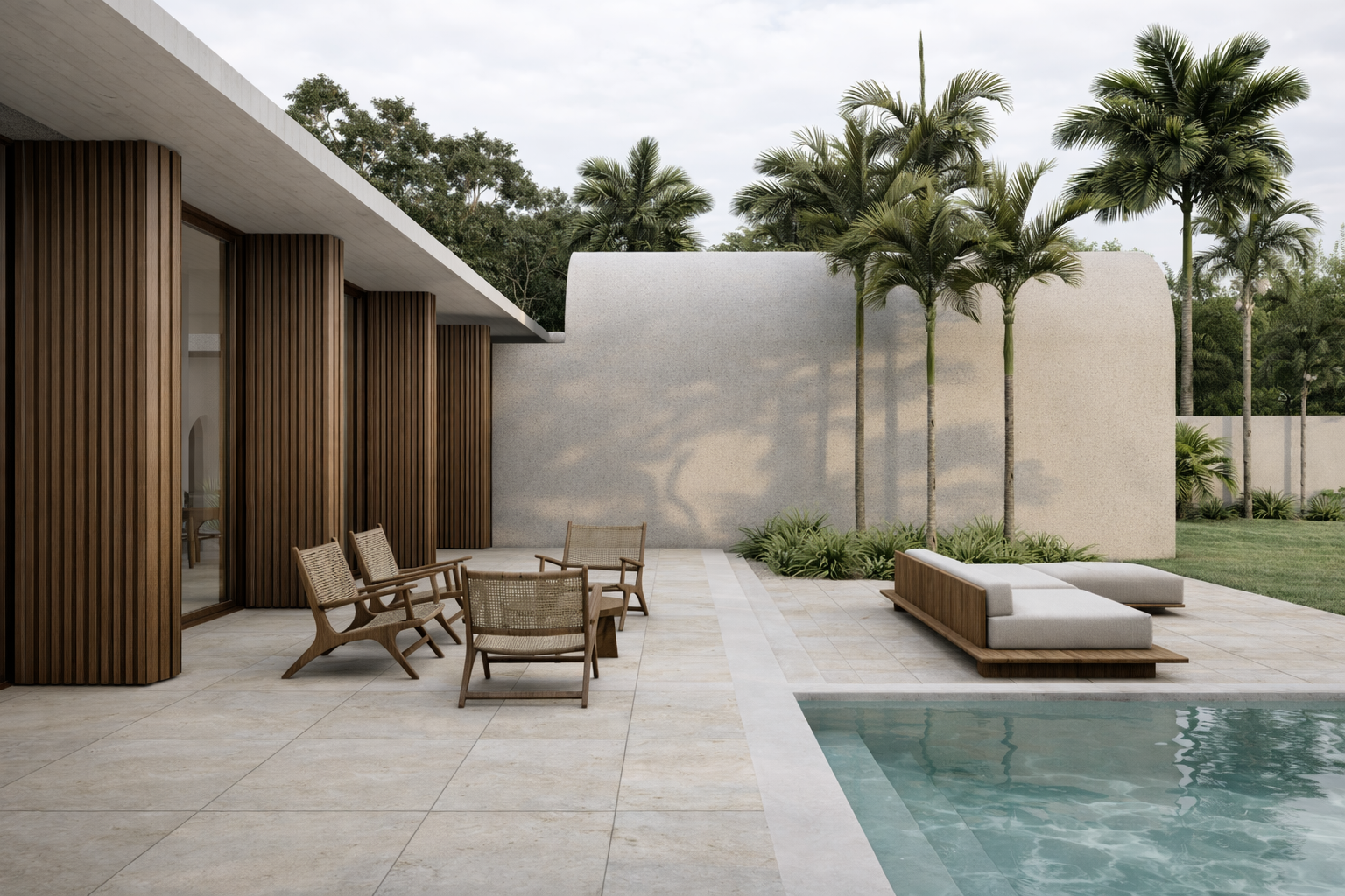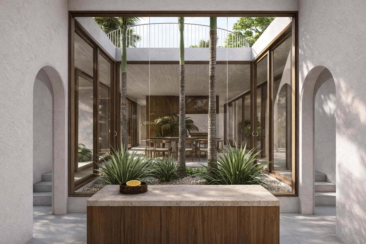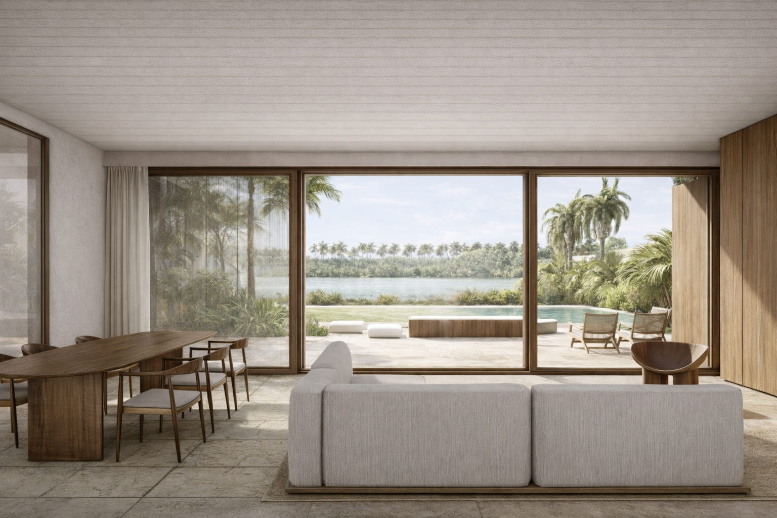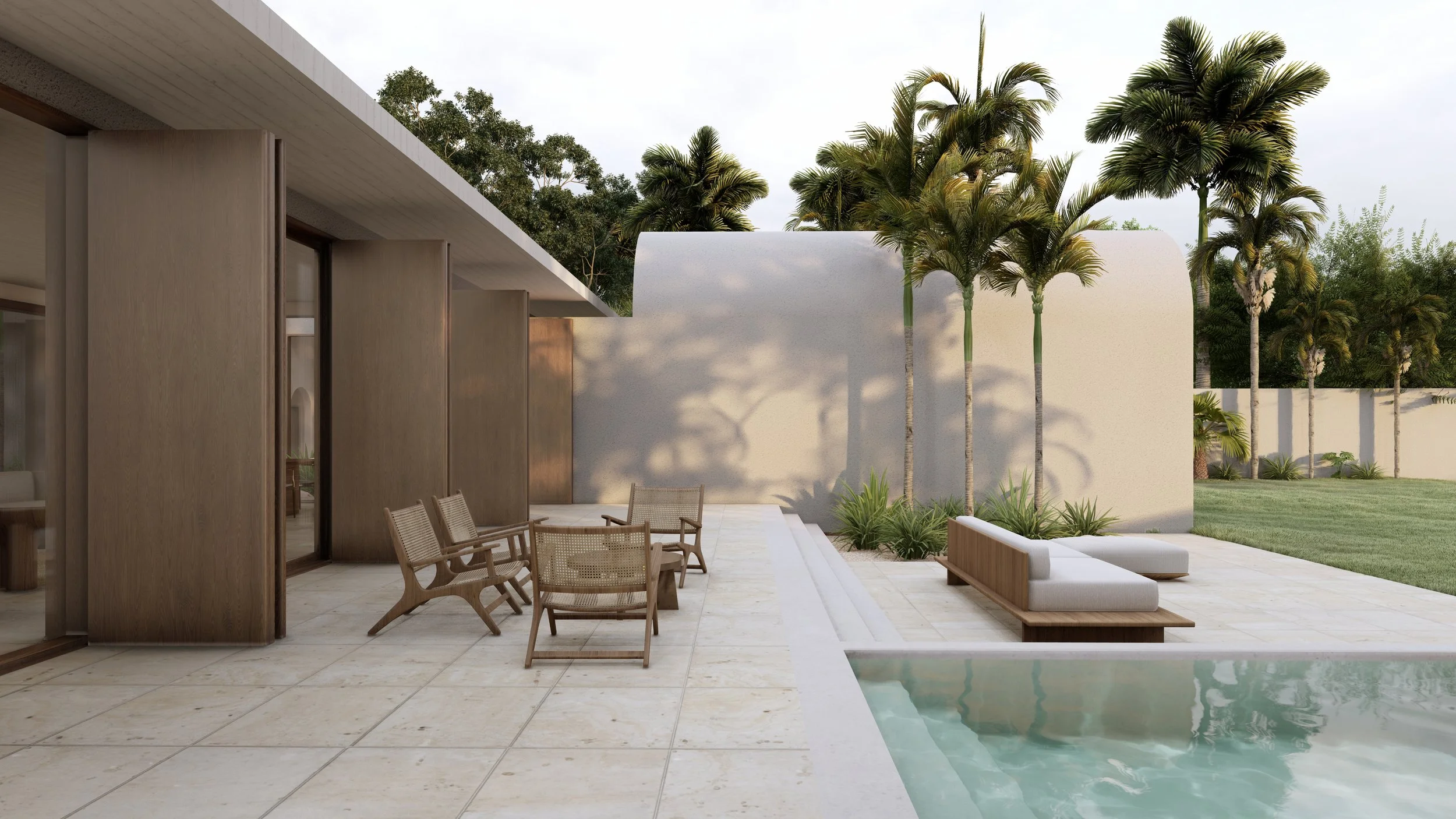 Le projet consiste en la création d'une villa de plain-pied située en bord de lagune à Adounko. Le concept se base sur une configuration à lanières qui oriente tous les espaces en direction de la lagune. Chaque pièce de vie, à l'exception du bureau et de la cuisine, bénéficie ainsi d'une vue sur les rives. Cette disposition optimale permet à la maison de profiter des vents dominants et du soleil. La maison se positionne sur deux demi-niveaux, pour tirer parti du dénivelé du terrain et pour rester à l'écart de la lagune. Le niveau inférieur abrite les chambres et une partie des espaces de jour, tandis que le niveau supérieur comprend le salon et une terrasse qui offre une vue sur la lagune et la piscine. Un patio central apporte de la lumière et de la verdure au cœur de la maison, tout en maintenant une continuité visuelle entre les espaces.