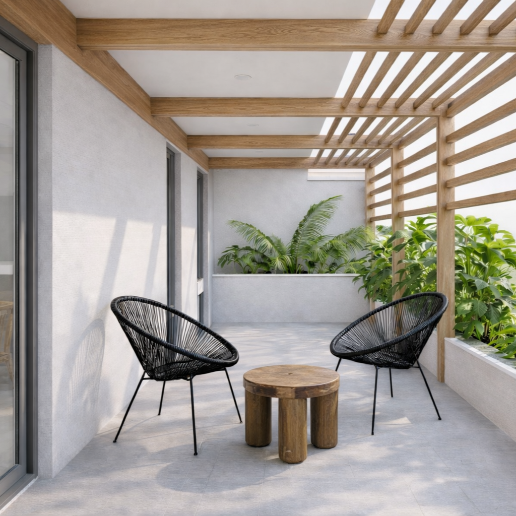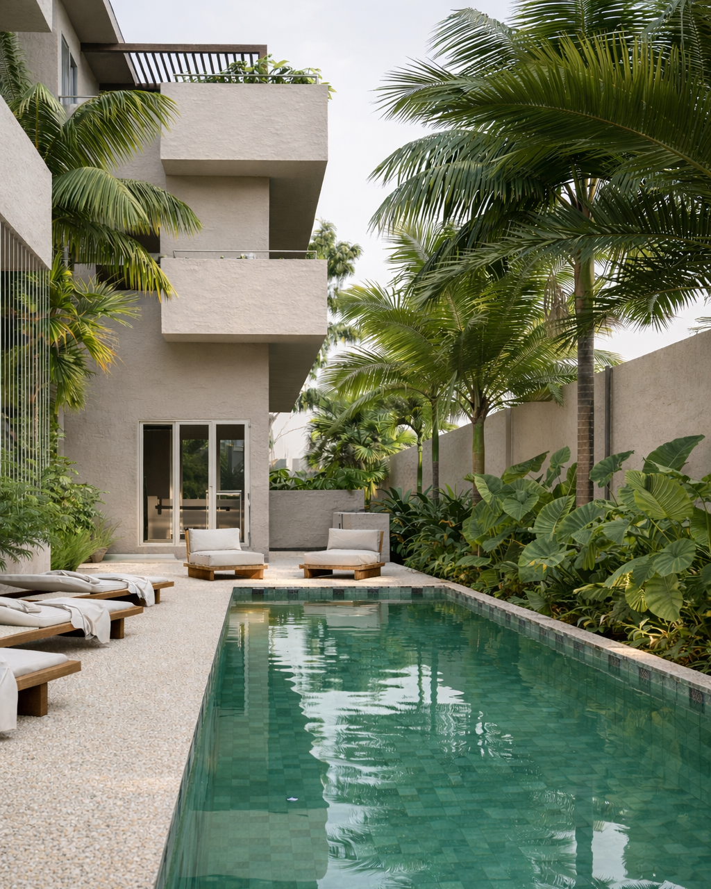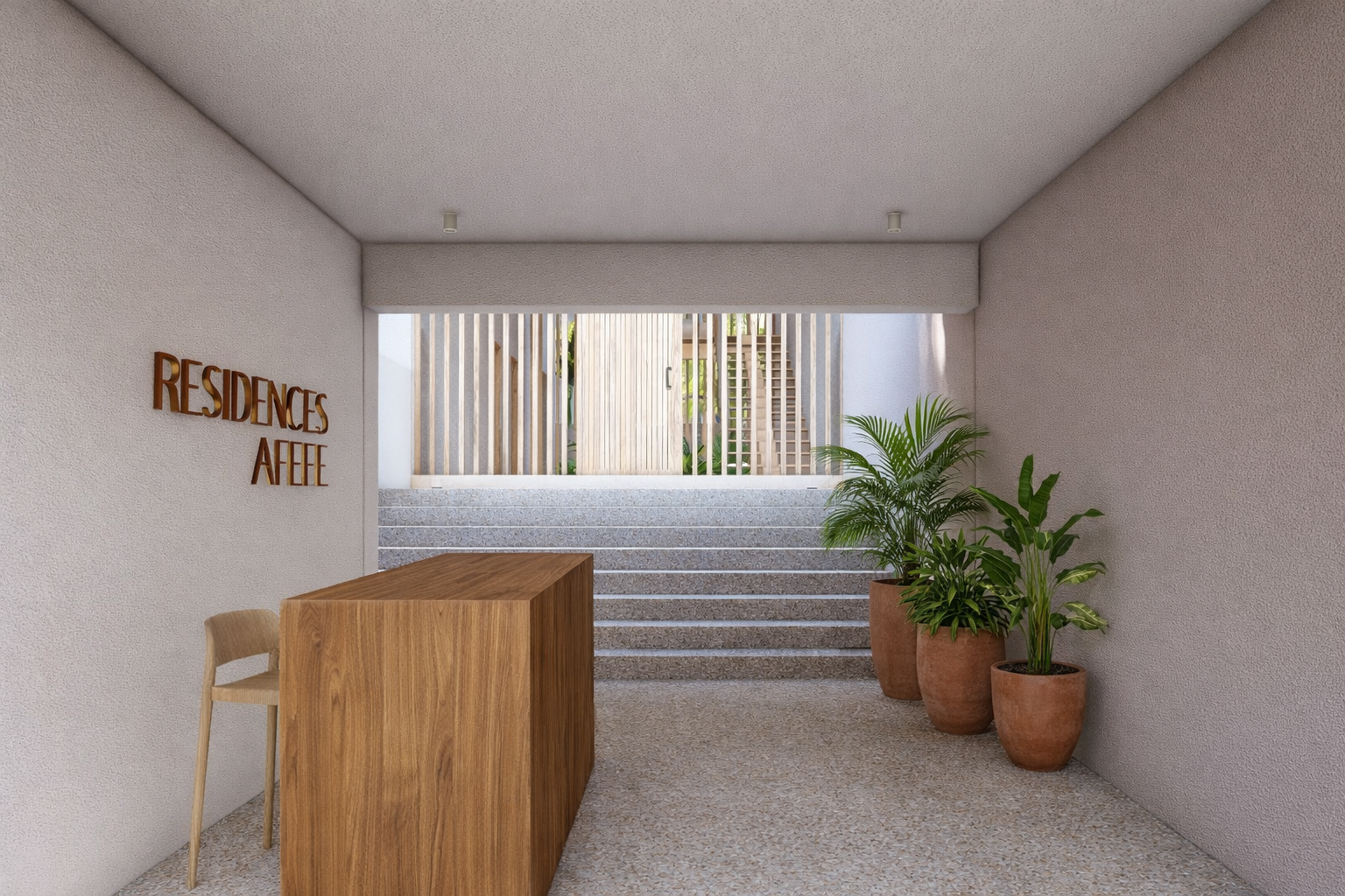 L'entrée principale mène à un hall d'entrée ouvert avec un patio verdoyant et un escalier élégant, facilitant l'accès aux étages. Les appartements en duplex ont une entrée privée avec cour et garage, tandis que les autres unités disposent d'un accès indépendant. Les espaces de vie sont conçus pour optimiser la ventilation et l'éclairage naturels, avec de larges ouvertures et terrasses orientées vers les vents et la mer. Les matériaux utilisés, tels que les briques de terre cuite, les enduits beige et blanc, le métal ocre marron, et le carrelage en pierre de Bali, assurent un confort thermique et une esthétique harmonieuse.